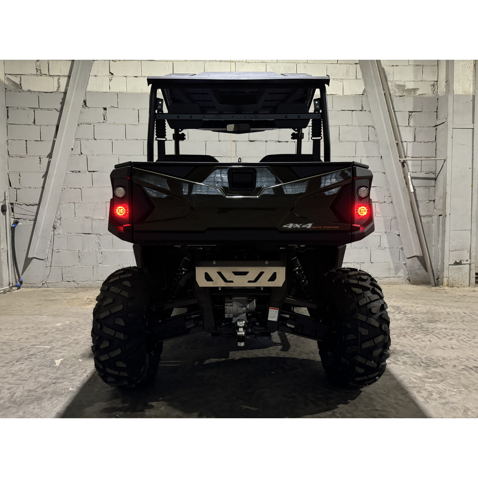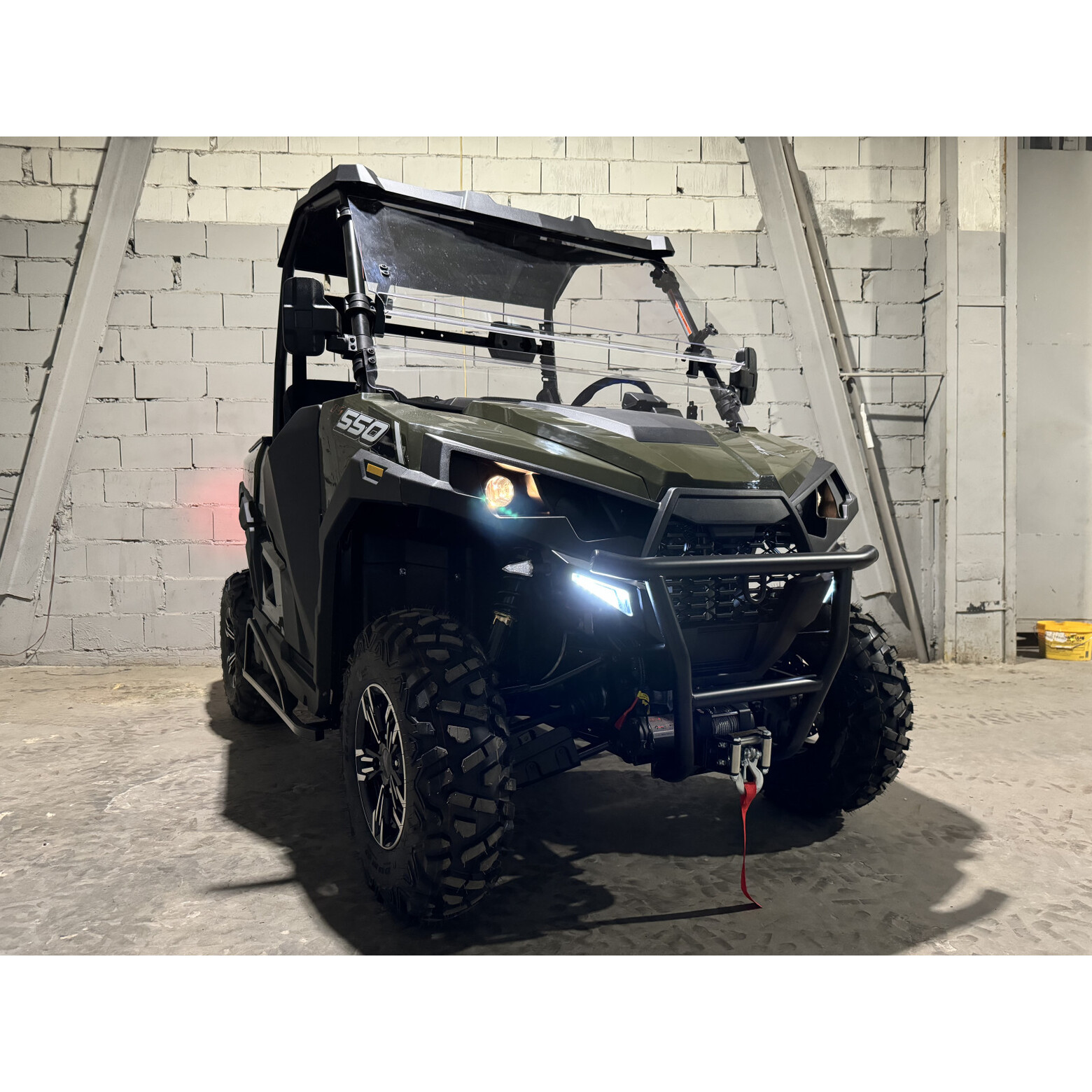 Знаменитый UTV 550 T-Boss EPS стал еще лучше, прочнее и долговечнее. Современный дизайн со спортивным акцентом и новые алюминиевые диски привлекают внимание с первого взгляда. Усилитель руля делает вождение приятным и легким даже при полной загрузке. Новый стальной кузов выдерживает даже суровые переезды. Кроме того, двигатель совершенно новый, мощнее, живее и экономичнее. Новый Linhai-Yamaha 550 T-BOSS EPS — идеальный помощник для любых работ в лесу, на строительных площадках, в парках, в саду, на спортивных объектах и для снабжения горных отелей.Новый одноцилиндровый двигатель с электронным впрыском обладает повышенной мощностью, которой достаточно для интенсивной работы и быстрого разгона. Современный впрыск топлива обеспечивает низкий расход топлива и низкий уровень выбросов. Передачу мощности обеспечивает надежная автоматическая коробка передач ведущего канадского производителя CVTech, которая также оснащена парковочным режимом P.Широкая конструкция шасси обеспечивает устойчивость на любой местности, большой ход подвески и низкий центр тяжести обеспечивают комфортное вождение. Все колеса имеют независимую подвеску. Комфортное вождение также обеспечивается соответствующей развесовкой и небольшим радиусом поворота.Многофункциональный ЖК-дисплей с синей подсветкой легко читается и содержит всю необходимую информацию: цифровые тахометр и спидометр, индикатор пробега, индикатор моточасов, индикатор привода 2х4/4х4, индикатор температуры охлаждающей жидкости, цифровой индикатор уровня топлива, индикатор нейтральной передачи, Индикатор дневных ходовых огней, поворотников и задней передачи.Linhai UTV 550 T-BOSS EFi EPS в стандартной комплектации оснащен прочной, устойчивой к ультрафиолетовому излучению крышей, двойным плексигласом, массивным передним обводом, пластиковые двери, ручками для пассажиров, большим транспортировочным ящиком, подголовниками, буксирным крюком и лебедкой с дистанционным управлением и тяговым усилием 3000 фунтов.