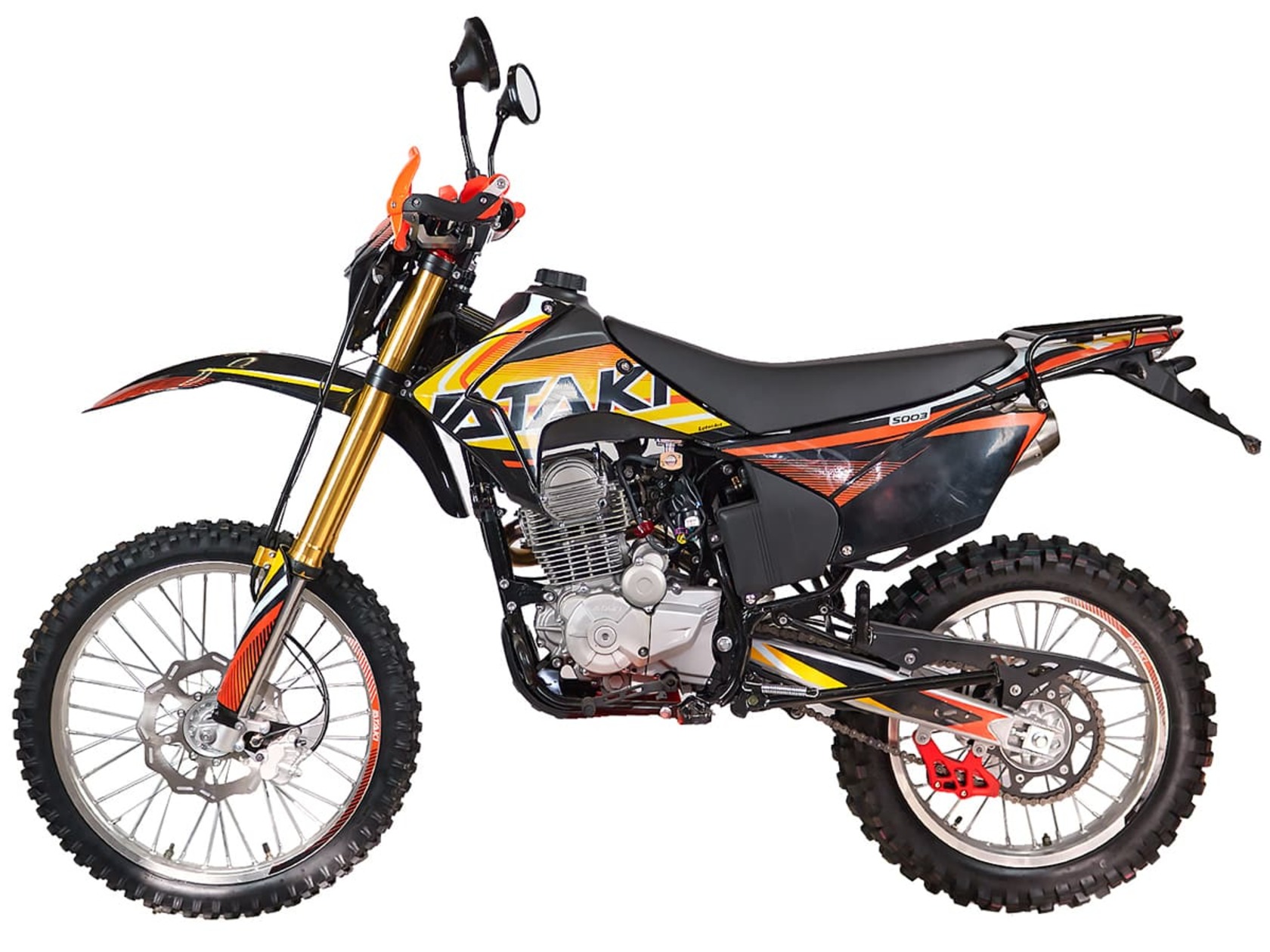 1Мотоцикл ATAKI S003 300 (4T PR300) ПТС 21/18 (2024 г.) – современный и стильный дуал-спорт для городской езды и спортивных приключений. Оснащён одноцилиндровым 4-тактным двигателем ZONGSHEN PR300/ZS175FMM-5 с воздушным охлаждением и объёмом 271 см3. За подачу топлива отвечает карбюратор PD30. Мотор способен выдавать мощность в 24 л.с. Коробка передач механическая с 5 ступенями, имеет классическую схему 1-N-2-3-4-5. Ёмкость бака 9 литров. На мотоцикле используются колёса 21 дюйм спереди и 18 дюймов сзади. Подвеска спереди представлена телескопической вилкой перевёрнутого типа длиной 880 мм. Подвеска сзади – моноамортизатор длиной 380 мм с 2 положениями по высоте. Тормоза – дисковые гидравлические.Имеет цифровую приборную панель и светодиодную фару. Модель обладает ПТС и подходит для использования на дорогах общего пользования. Габариты мотоцикла 2100×810×1180 мм. Высота по седлу 900 мм. Вес 119 кг.