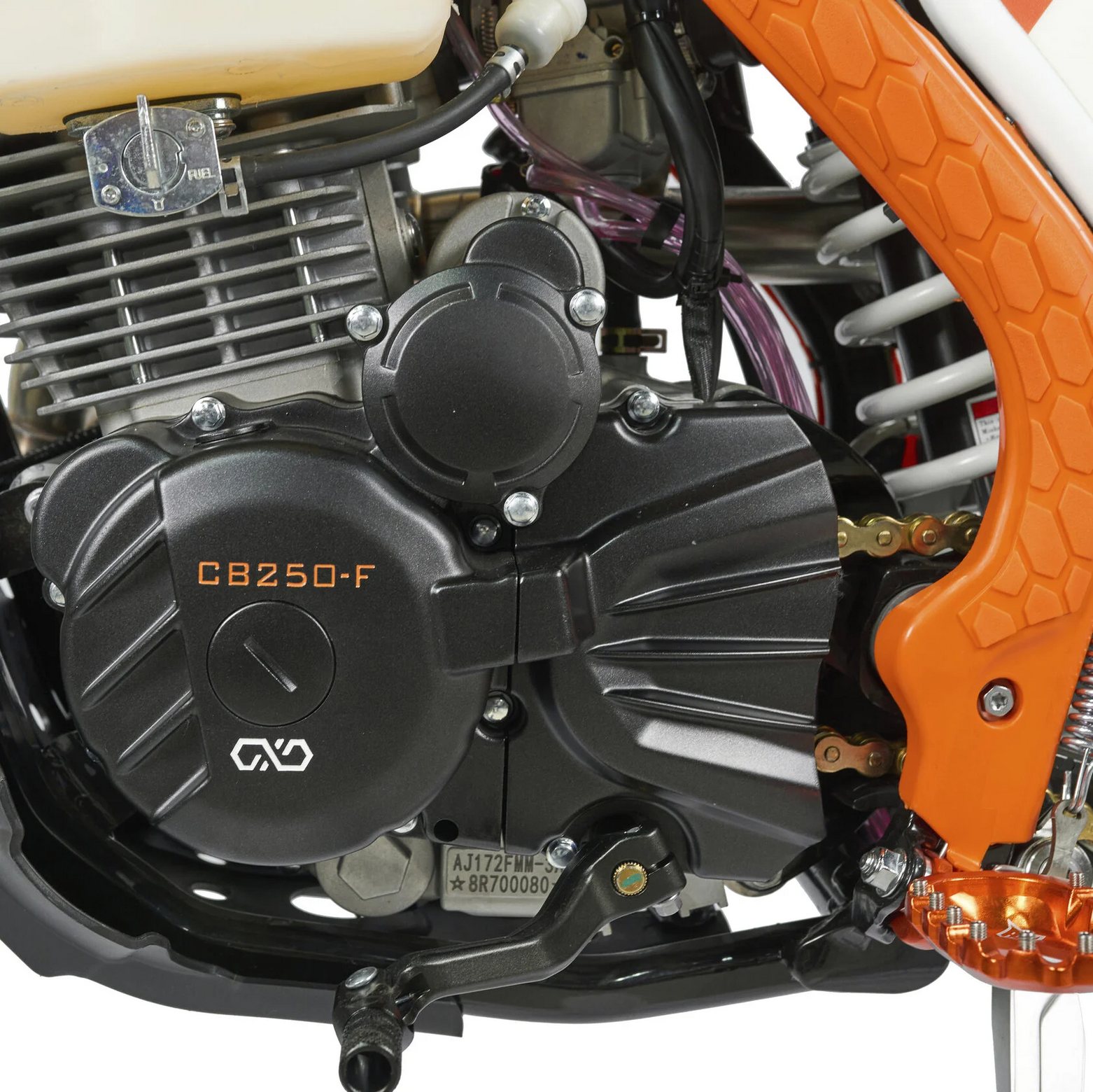 КомплектацияЭлектронная приборная панель, противоскользящее сиденье, защита рамы от протирания ботинками, подножки «AJ1» (алюминий 6063 с шипами), подножка боковая «AJ1» (алюминий 7075-Т6), невозгораемый воздушный фильтр «AJ1» – Twin Air с увеличенной площадью, ведомая звезда «AJ1» (520, алюминий 7075-Т6), защита рук, грипсы OTOM/Lock-On, передние и задние буксаторы «AJ1», откидные алюминиевые рычаги 270, алюминиевая лапка КПП, пульт света КТМ, LED фара 5 линз, моточасы, фрезерованная траверса X trig .ДвигательМодель оснащена надежнейшим 1-цилиндровым 4-х тактным двигателем ZONGSHEN 172FMM-3A с воздушным охлаждением объёмом 249,9 см3, который выдаёт 21 л.с.ПодвескаПередняя вилка "MNT" перевернутого типа T7 48- 910mm с регулировкой на сжатия и отбой. Моноамортизатор "MNT" также с регулировками. Система прогрессии, обеспечивает равномерную, мягкую работу и увеличивает длину рабочего хода подвески. Также ось крепления маятника совпадает с осью крепления ножки. Это существенно улучшает развесовку мотоцикла.КолесаСпереди и сзади установлены антибуксаторы бренда "AJ1", которые притягивают покрышку к ободу, позволяя ездить по бездорожью при низком давлении в камерах, не давая покрышке проворачиваться во время езды. Размер передней покрышки: 80/100 R21. Размер задней покрышки: 120/90-R18. Модель комплектуется "жирной" резиной "KENDA". Все эти характеристики позволяют мотоциклу отлично себя чувствовать в песке и грязи.Тормозная системаПолностью гидравлическая с армированными шлангами. Спереди и сзади установлен двухпоршневой суппорт. Данная конфигурация тормозных механизмов, позволяет быстро и безопасно оттормаживаться даже в самых непростых условиях.Сухой вес мотоцикла 115кгКубатура: 249.9Двигатель: Zongshen ZS 172FMM-3AКолёса: 21/18Охлаждение: ВоздушноеКПП: МеханическаяДxШxВ: 1610x455x870 ммВес: 140000 г