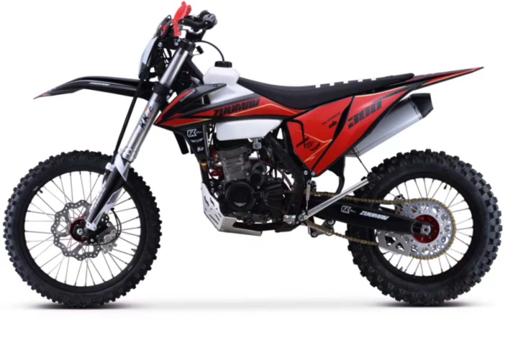 Новинка от компании ZUUMAV с хорошей комплектацией. Рама повышенной прочности из хром-молибдена, маятник алюминиевый. Двигатель с балансирным валом с хорошими техническими характеристиками ZS174MN-5 с балансировочным валом. В паре с ним работает карбюратор NIBBI RACING PWK34, данная связка позволяет достичь 28 л.с. с отличной тягой во всем диапазоне работы. У кроссового мотоцикла Zuumav FX K8 NB300 водяное охлаждение с вентилятором от компании PANASONIC. Передняя вилка полностью регулируемая KKE 54*60- 940 мм со штоком 48 мм, задний амортизатор полностью регулируемый ККЕ с алюминиевой прогрессией. Из электроники установлен: цифровой дисплей, счетчик моточасов и диодная фара с ходовыми огнями. Топливный байк 10 литров.