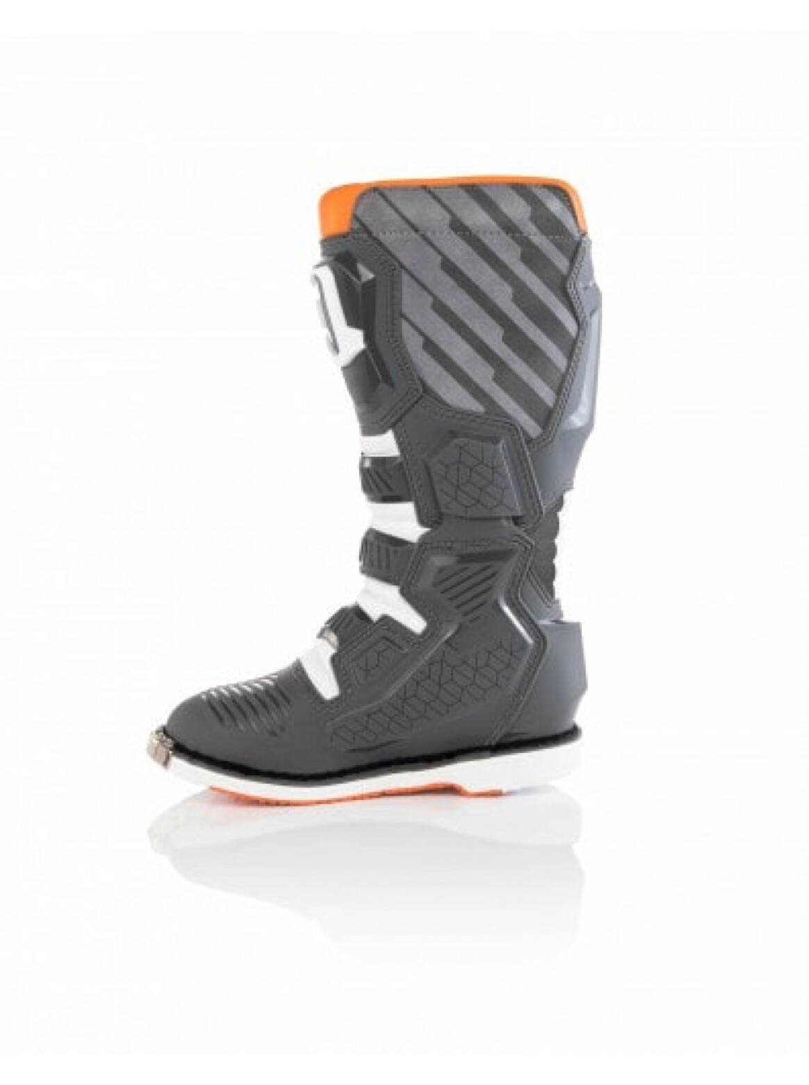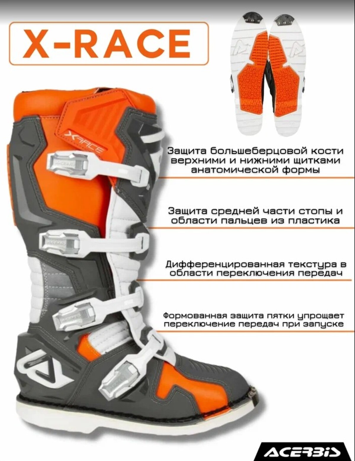 Легкие, защитные, анатомические ботинкиИзносостойкая кожаЗащита большеберцовой кости верхними и нижними щитками анатомической формыФормованная защита пятки упрощает переключение передач при запускеЗащита средней части стопы и области пальцев из пластика с ребрами жесткости для лучшего поглощения ударовДифференцированная текстура в области переключения передач для максимального контроля при переключении передач4 пряжками с большими алюминиевыми рычагамиМягкие и обволакивающие гетры из микрофибрыЗастежка-липучка, обеспечивает идеальную посадку гетры к ногеПротивоударная подошва Acerbis, устойчивая к маслам, бензину и износуАнтибактериальная амортизирующая стелькаПодкладка изготовлена из 3D сетки для оптимального комфорта и поглощения потаУсиленный стальной носокСостав: рециклированная кожа 41%, замша 10%, ТПУ 34%, ткань 15%