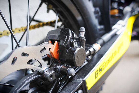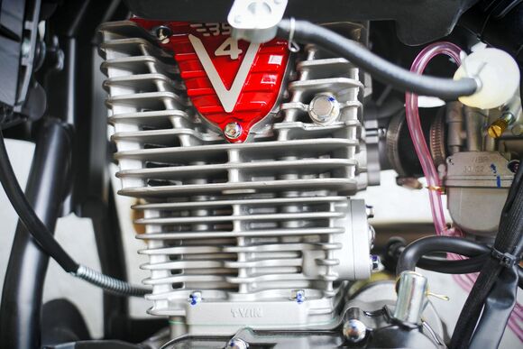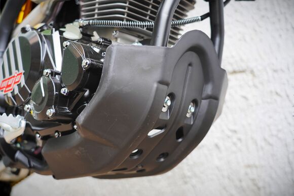 ДОПы New Мощная тормозная гидравлическая система с дисками диаметром 240 мм, звезды 13t – 49t, «зубастые» покрышки Carrystone 80/100-21 спереди и 110/90-18 сзади. Мотоцикл оснащается полностью светодиодной фарой головного света, грипсами и ручкой газа Nibbi Racing, цепкой шкуркой сиденья