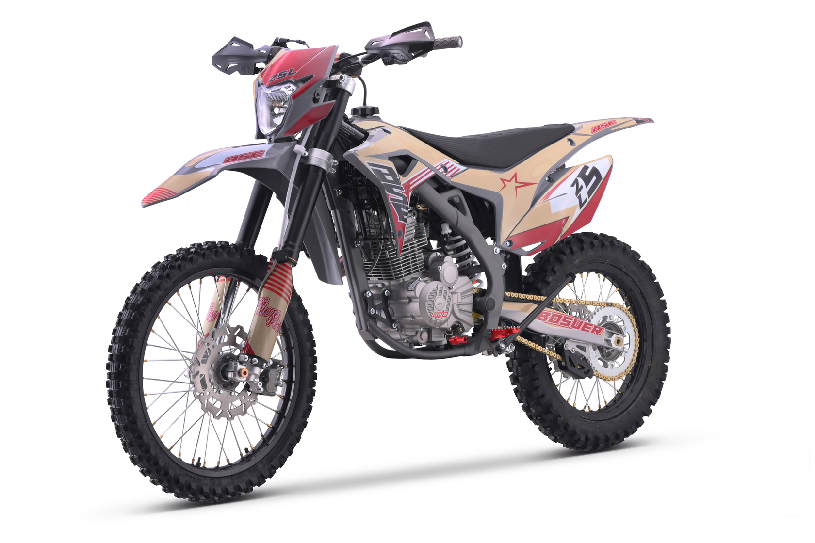 За основу мы взяли успешный полноразмерный Z5 и упростили комплектацию, чтобы сделать максимально привлекательный прайс, оставив главные компоненты — надежный 250-кубовый мотор Zonsen и усиленную стальную раму Bosuer. В итоге получили полноразмерный, функциональный и мощный эндуро мотоцикл. Идеально сбалансированный, устойчивый и готовый прощать ошибки при езде.Сердце Z5L – мощный, эластичный и надежный 250 кубовый Zonsen ZS172FMM-3A (CB250-F), 21 лс, воздушное охлаждение. Система подачи топлива – проверенный карбюратор NIBBI PWK34.Z5L уже в заводской комплектации готов к покорению серьезного бездорожья: нерегулируемая энергоемкая подвеска с большими ходами, вилка “перевертыш” и наличие рычагов задней прогрессии. Установлена “злая” внедорожная резина Carrystone. Мощная гидравлическая тормозная система HSК Racing остановит байк в любых условиях. На мотоцикле установлены: усиленные черные колёсные диски MOJO, CNC подножки c увеличенным зацепом, датчик моточасов, защита рук, грипсы и ручка газа Nibbi Racing. В фару установлена диодная лампа.Среднеразмерный Z5L подойдёт для райдеров начального и среднего уровня, которые не готовы переплачивать за более богатую комплектацию. Крепкий, надёжный и неприхотливый BSE Z5L обладает всеми качествами настоящего эндуро байка при доступной цене.