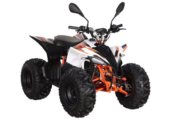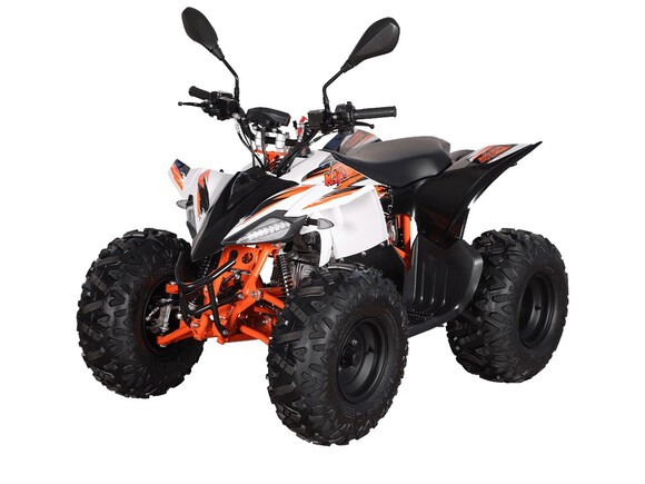 Квадрицикл KAYO AT110 – выносливая модель для освоения спортивной езды по бездорожью или помощи в хозяйстве. Хорошо подходит для детей и подростков, интересующихся поездками за пределами проторенных троп.Одноцилиндровый 4-тактный двигатель YX1P53FMH-2 с верхним распредвалом и воздушным охлаждением имеет объём 107 см3. Максимальная мощность 7,2 л.с. За подачу топлива отвечает карбюратор. Привод осуществляется на 2 колеса. Трансмиссия имеет автоматическую коробку передач со схемой F-N-R.Запуск осуществляется с помощью системы электронного зажигания. Имеется функция родительского дистанционного выключения двигателя.На квадрицикле используются колёса диаметром 8 дюймов. Амортизаторы подвески имеют длину 265 мм, задние можно регулировать. За торможение отвечает гидравлическая дисковая система. Клиренс составляет 110 мм, колёсная база 920 мм.Габариты модели 1360х840х880 мм, высота по седлу 660 мм, вес 98 кг. Ёмкость бака 4 литра.Наличие ПТС позволяет зарегистрировать технику на дорогах общего пользования.