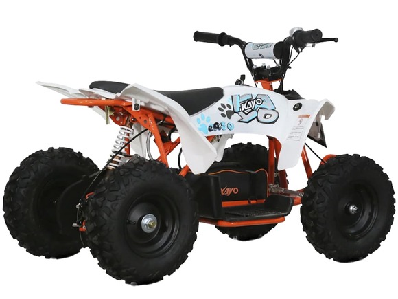 Квадроцикл KAYO EA50 – детская модель с электрическим двигателем для весёлых и безопасных заездов на природе.Оснащён электрическим бесщёточным двигателем мощностью 500 Вт. Обеспечивает плавную и бесшумную езду без выхлопных газов. Свинцово-кислотный аккумулятор 36V12AH обеспечивает запас хода в 90 минут езды. Полная зарядка аккумулятора занимает около 8 часов. Трансмиссия представлена 2-ступенчатой коробкой с реверсом.Диаметр колёс 6 дюймов. Амортизация спереди отсутстсвует. На задних колёсах установлен моноамортизатор длиной 200 мм. Спереди и сзади установлены механические дисковые тормоза.Приборная панель представлена электронным дисплеем, куда выводится информация о скорости, заряде аккумулятора и километраже.Габариты квадроцикла 1030х580х660 мм.Внимание: поставляется в разобранном виде. Предназначен для самостоятельной сборки.