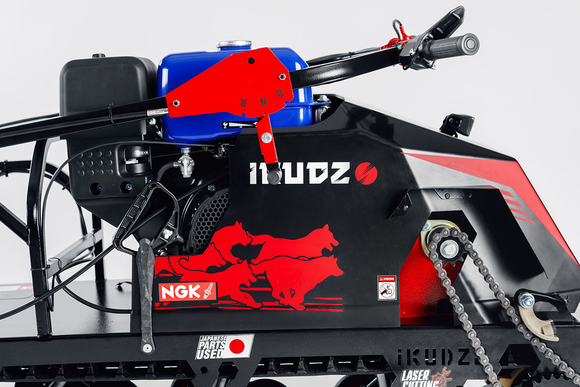 • 12. Мотобуксировщики IKUDZO имеют идеальную балансировку и нагрузку на гусеницу. Двигатель размещён так, что даже без дополнительного груза на мотособаке давление на снег будет равномерно, что значительно повышает проходимость!