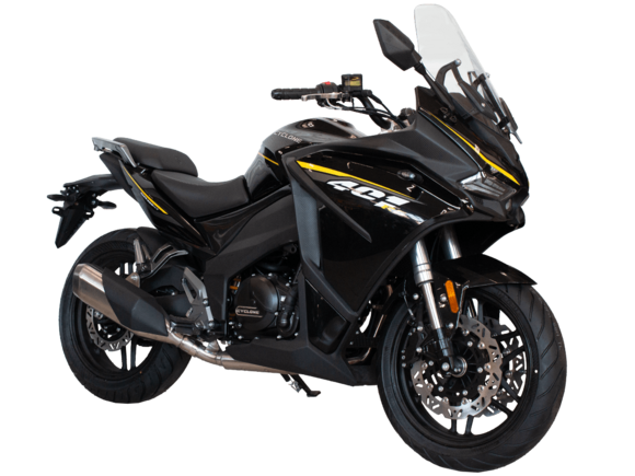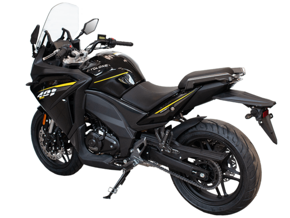 CYCLONE RG401 (SR400GS-B) – турист для покорения самых непростых и протяжённых маршрутов. Он обладает стремительным и современным дизайном в лучших “традициях жанра” туристических мотоциклов.Рядный двухцилиндровый четырёхтактный двигатель объёмом 401 см3 выдаёт 43 л.с. на 9500 об/мин. Максимальный крутящий момент достигается на 8000 об/мин и составляет 37 Н·м. Инжекторный впрыск топлива с блоком управления BOSCH увеличивает топливную экономичность, а также позволяет добиться высокой приёмистости и неприхотливости агрегата. Жидкостная система охлаждения не допустит перегрева двигателя а даже на самых непростых маршрутах. На мотоцикл установлена 6-ступенчатая механическая коробка передач.Максимальная скорость мотоцикла составляет 155 км/ч.RG401 оснащён литыми алюминиевыми дисками диаметром 17 дюймов. Колёса обуты в бескамерные покрышки TIMSUN. С неровностями дороги эффективно справляются телескопическая вилка перевёрнутого типа спереди и маятник с моноамортизатором сзади. Ход передней подвески составляет 120 мм, задней – 55 мм. Оба компонента подвески являются регулируемыми. Эффективное и безопасное замедление с любых скоростей обеспечивают гидравлические дисковые тормоза с двухканальной системой ABS спереди и сзади.Клиренс мотоцикла составляет 155 мм. Объём топливного бака – 21 л. Снаряжённая масса – 213 кг.Модель имеет два видеорегистратора, механическую регулировку ветрового стекла, датчики давления в шинах, подсветку пультов и два USB-порта. При желании можно оснастить мотоцикл двумя боковыми кофрами.Мотоцикл сочетает в себе отличные технические характеристики, комфорт и надёжность, что позволяет вам ощутить настоящую свободу на любой дороге.