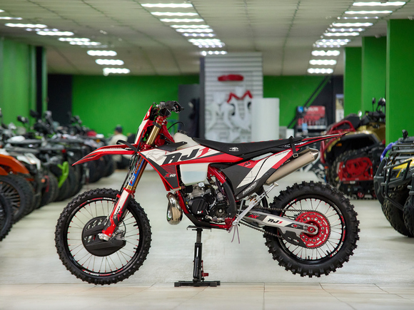 Подробнее о AX300Модифицированная подвеска разработанная AJ1 совместно с HTW, регулировать которую можно теперь без применения инструментов, «на ходу». Двухкамерная передняя вилка с закрытым картриджем (DCC) серии AJ1-T10 с диаметром пера 48 мм и длиной 940 мм, в которой используются двукомпонентные сальники SKF Италия, а также высококачественные направляющие от японской фирмы DID ЯпонияМоноамортизатором HTW T10 регулировка без инструмента с системой PDSНовые фрезерованные траверсы со всеми регулировками а также руль переменного сечением из высокопрочного алюминиевого сплава марки 7075-T6.Новая запатентованная конструкция воздушного фильтра AJ1-Pro Red. Предварительно пропитанный смазкой - фильтр специально создан для обеспечения максимального потока воздуха, сделанный из негорючего материала.Новые радиаторы и дефлекторы воздуха позволили повысить набегающий поток и улучшить охлаждение при движении.Широкие фрезерованные подножки AJ1 из алюминиевого сплава, со сменными шипами из нержавеющей стали.Обода из алюминия 7050-T6 в стандартной комплектации имеют подшипники NSK, 4-мм спицы из нержавеющей стали и алюминиевыми ниппелями в сочетании с новыми шинами AJ1 soft compound обеспечивает постоянное сцепления колес в разных дорожных условиях.Размер колес: перед – 80/100-21 зад – 120/100-18Новый алюминиевый маятник без прогрессии + направлющими с низким коэффициентом трения обеспечивает лучший контроль и экономию веса, необходимую на треке и в горах.Запатентованная тормозная система AJ1 зарекомендовавшая себя, как лучшая в классе, великолепно работающая с тормозными дисками нового дизайн и синтетическими спеченными тормозными колодками Elig Тайвань. Спереди установлен двухпоршневой суппорт AJ1 в сочетании с диском диаметром 260 мм. Сзади – однопоршневой суппорт с диском диметром 220 ммВ стандартную комплектацию входит новая алюминиевая складывающаяся боковая подставку нового дизайна, а также фирменное сиденье AJ1Anti Skid, выполненным из нескользящего материала со специальными прорезиненными вставками.Ведомая звезда AJ1 520 на 52 зубаВыхлопная титановая система AJ1 с Power Bomb и DB-Killer (съёмный) легче на 1 кг предыдущих выхлопных систем от AJ1