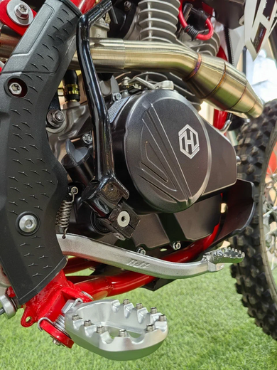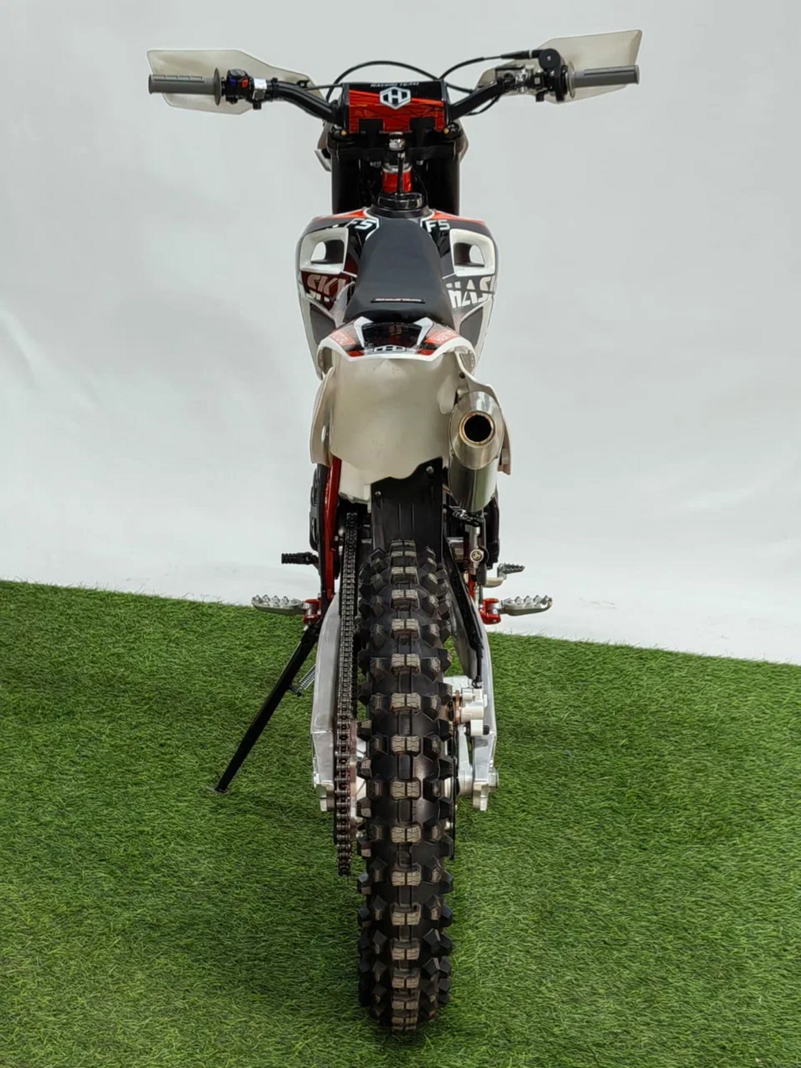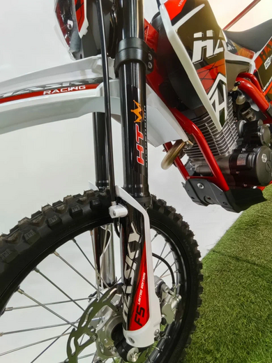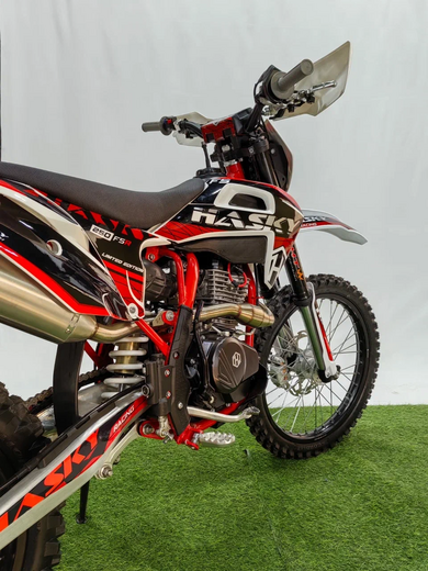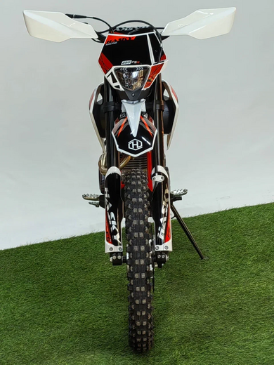 Для истинных ценителей мотоспорта компания Hasky представляет специальную версию своего флагмана – F5 Racing Limited Edition. Этот среднеразмерный эндуро-байк с колесной формулой 21/18 дюймов создан для тех, кто требует от техники максимальной отдачи и надежности в экстремальных условиях.В основе мотоцикла лежит двигатель LONCIN YB300H 4T, работающий в паре с 5-ступенчатой коробкой передач. Спортивный карбюратор Nibbi PE 30 Race обеспечивает мгновенную реакцию на ручку газа, а электростартер гарантирует беспроблемный запуск в любых условиях. Подвеска профессионального уровня включает передние амортизаторы HTW с диаметром пера 43 мм и задний моноамортизатор той же марки, что обеспечивает превосходную управляемость на сложном рельефе.Мотоцикл оснащен усиленными алюминиевыми ободами Unison 7016, покрышками Soft (120/90-18 сзади и 80/100-21 спереди) и специальными камерами с усиленной 3-мм стенкой. Руль из высокопрочного сплава 7075 в сочетании с эргономичными грипсами Lock-on обеспечивает полный контроль над байком. Особого внимания заслуживает система безопасности: влагозащищенная проводка, складной рычаг сцепления на 360, защита рук и мощная светодиодная фара с пятью линзами.