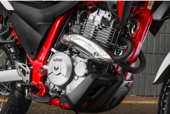 Мотоцикл Minsk GOOSE 400 - высокий ветровик, острый «клюв» переднего крыла под фарой, уверенная прямая посадка и спицованные колеса обещают комфортное передвижение как по трассам, так и по всевозможному бездорожью.Подвеска мотоцикла рассчитана на работу в условиях бездорожья, но не будет ощущаться как слишком мягкая на ровном асфальте. Двигатель одноцилиндровый, четырехклапанный, с двумя распредвалами, воздушно-масляным охлаждением и пятиступенчатой трансмиссией. В системе питания применен карбюратор. Это решение продиктовано меньшей стоимостью в сравнении с инжекторной системой питания, более простой конструкцией и повышенной ремонтопригодностью. При этом мощность двигателя составляет 27,3 лошадиные силы, с впечатляющим значением крутящего момента в 32,5 Н/м, которые выдаются уже при 5000 об/мин, позволяя развивать скорость до 120 км/ч. Воздушно-масляная система охлаждениямотора реализована с использованием передней части рамы в качестве радиатора. Это позволило исключить лишние детали и компоненты, а значит и возможность их повреждения. За характерную внешность мотоцикл еще до официального выхода на рынок получил понятное каждому турэндуро прозвище «Гусь».
