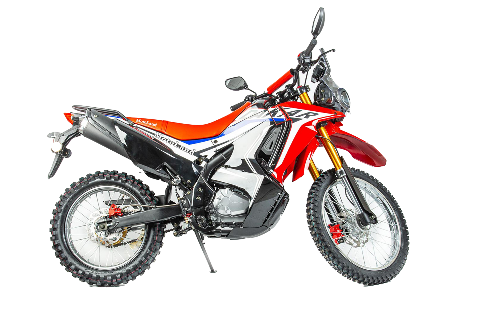 Новинка 2020 года - Мотоцикл Motoland DAKAR 250 ST.Данный мотоцикл прост в управлении и неприхотлив в обслуживании и подходит мотолюбителям Эндуро любого возраста,и опыта вождения, которым нужна техника для поездок из точки А в точку Б и обратно по дорогам и легкому бездорожью.Motoland DAKAR 250 ST оснащен одноцилиндровым четырехтактным двигателем 172FMM мощностью 21 л. с. и объемом 250 см³ с воздушным охлаждением. Установлен карбюратор PZ 30 с ускорительным насосом увеличивает скорость разгона.Для запуска двигателя можно использовать электростартер или кикстартер.Механическая трансмиссия содержит 5 передач.Мотоцикл оснащен надежными передними и задними тормозами с двух поршневыми тормозными суппортами.Колёса спицованные, размер заднего колеса — 18 дюймов, переднего — 21 дюйм. Весит 120 кг, выдерживает нагрузку до 150 кг.У нас Вы можете купить этот мотоцикл с бесплатной доставкой по РФ и гарантией до года. Также его можно приобрести в рассрочку или в кредит.