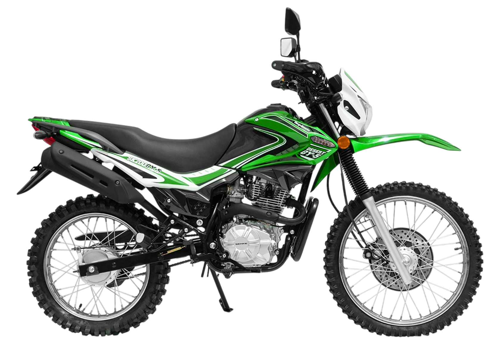 Regulmoto SK 200GY-5 – мотоцикл двойного назначения, созданный для эксплуатации как на дорогах общего пользования, так и на легком бездорожье. Топовая модель линейки лайт-эндуро мототехники известного китайского производителя Senke отличается высокой надежностью повседневной эксплуатации, отсутствием сложностей в сервисном обслуживании, простотой и легкостью управления.В надежной раме с защитными дугами Regulmoto SK 200GY-5 установлен 4-тактный одноцилиндровый двигатель с рабочим объемов в 20 см3, демонстрирующий максимальную мощность в 13.6 л.с. Мотор с воздушным охлаждением, в котором можно без труда признать реплику двигателя известного японского производителя, оснащается балансировочным валом, что позволяет избавиться от излишней вибрации.Подвеска мотоцикла на колесах 21/18 дюймов со стальными ободьями представлена телескопической вилкой-перевертышем спереди, перья которой закрыты защитой, и стальным маятником с моноамортизатором сзади. Тормоза у мотоцикла дисковые, спереди установлен 4-поршневой суппорт, сзади – 2-поршневой.Оснащение Regulmoto SK 200GY-5 соответствует возлагаемым на мотоцикл эксплуатационным задачам: на байке вполне комфортно передвигаться по дорогам и легкому бездорожью, чему способствуют достаточно большой ход амортизаторов, защита цепи, пластиковая защита рук. Среди установленного оборудования присутствуют: аналоговая приборная панель, замок зажигания с защитой от попадания песка и пыли, полный комплект светового оборудования с дополнительными светодиодными поворотниками, встроенными в боковые обтекатели, зеркала заднего вида, стояночная и центральная подножки.Данная модель мотоцикла присутствует на отечественном рынке мототехники уже достаточно длительное время, за которое мотоцикл зарекомендовал себя легким в эксплуатации и неприхотливым в обслуживании аппаратом. О высокой надежности мотоцикла говорят солидный километраж пробегов при отсутствии серьезных неисправностей и позитивные отзывы обладателей Regulmoto SK 200GY-5.У нас Вы можете купить этот мотоцикл с бесплатной доставкой по РФ и гарантией до года. Также его можно приобрести в рассрочку или в кредит.