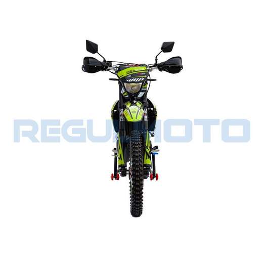 Стильный и доступный байк многоцелевого назначения найдет применение в качестве надежного аппарата для покорения бездорожья, а также может использоваться для решения широкого круга утилитарных задач и передвижения по дорогам общего пользования.В основе конструкции Regulmoto ZR 250 – мощная стальная рама, поставленная на колеса 21/18, которые наилучшим образом подготовлены к офф-роаду. Ободья и ступицы колес изготовлены из алюминия, также установлены усиленные спицы и буксаторы, надежно фиксирующие покрышки на ободе. Подвеску эндуро-байка представляют длинноходная телескопическая вилка-«перевертыш» спереди и стальной маятник с прогрессией и моноамортизатор с компенсационным резервуаром сзади. Работу амортизаторов при необходимости можно настроить при помощи регулировки сжатия/отбоя.Силовая установка мотоцикла представлена одноцилиндровым 4-тактным двигателем Zongshen ZS172FMM-5 (PR250) с воздушным охлаждением рабочим объемом в 249,9 см3 с балансировочным валом; за подготовку топливной смеси отвечает карбюратор Nibbi PE30. Технический потенциал надежного и производительного двигателя позволяет демонстрировать 21 лошадиную силу максимальной мощности и 18 Hm максимального крутящего момента.Regulmoto ZR 250 PR также привлекает внимание отличными внешними данными: мотоцикл комплектуется крепким и гибким пластиком с ярким дизайном, выполненным в узнаваемой стилистике популярной модели известного производителя.