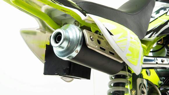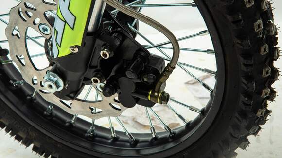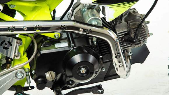 Недорогой надёжный питбайк APEX10 идеален для поездок по грунтовым дорогам и бездорожью для детей которые уже научились ездить на маленьких мотоциклах объемом 50 куб.см. Хорошо чувствует себя на мягком и среднем грунте.Питбайк прост в управлении и не требует специального ухода, подойдёт детям до 13 лет.У питбайка APEX10 отличный узнаваемый дизайн. Конструкция подчёркивает неуступчивый спортивный характер питбайка, который не остановится ни перед одним препятствием. Пластик комбинированный, прочный, не ломается при сгибании.Передняя подвеска — телескопическая нерегулируемая вилка перевёрнутого типа, которая отлично подходит для преодоления ям, ухабов и других неровностей плохих дорог или их отсутствия. Задняя подвеска маятниковая с моноамортизатором. Руль 22 мм с высоким подъёмом и перекладиной удобен для мотоциклистов разного роста.Питбайк весит всего 65 кг, при этом выдерживает вес до 75 кг. Оснащён CNC траверсами, рама полудуплексная стальная, мотоцепь качественная. Колёса спицованные