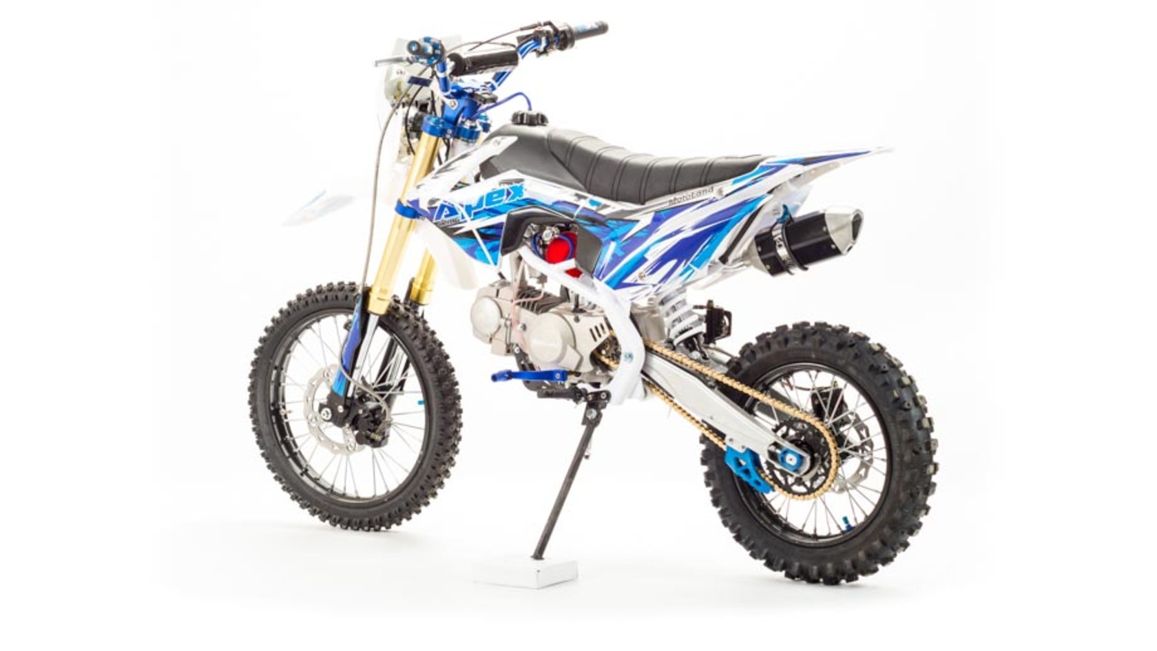 Недорогой надёжный питбайк APEX125 идеален для поездок по грунтовым дорогам и бездорожью. Хорошо чувствует себя на мягком и среднем грунте, разгоняется до 90 км/ч. Оснащён CNC траверсами, фарой, алюминиевыми ободами, весит всего 90 кг. Питбайк прост в управлении и не требует специального ухода, подойдёт как новичкам, так и любителям мотокросса.У кроссового мотоцикла APEX125 отличный узнаваемый дизайн. Конструкция подчёркивает неуступчивый спортивный характер питбайка, который не остановится ни перед одним препятствием. Пластик комбинированный, прочный, не ломается при сгибании. Кроссовый мотоцикл APEX125 доступен в красном и синем цвете, при этом в основной цвет окрашен не только пластик, но и обода колёс и другие детали питбайка.Передняя подвеска — телескопическая нерегулируемая вилка перевёрнутого типа, которая отлично подходит для преодоления ям, ухабов и других неровностей плохих дорог или их отсутствия. Задняя подвеска маятниковая с моноамортизатором. Руль 22 мм с высоким подъёмом и перекладиной удобен для мотоциклистов разного роста. Ручки руля — комфортные PRO TAPER. Питбайк оснащён складными рычагами сцепления и переднего тормоза, а также CNC-лапкой переключения передач.Питбайк весит всего 75 кг, при этом выдерживает вес до 150 кг. Оснащён CNC траверсами, рама полудуплексная стальная, мотоцепь качественная. Колёса спицованные, сделаны из прочного и лёгкого алюминия. Размер заднего колеса — 14 дюймов (350 мм), переднего — 17 дюйм (430 мм). Тормоза дисковые, передний тормозной суппорт двухпоршневой, задний — однопоршневой.Питбайк оснащён карбюратором с фильтром нулевого сопротивления VM22 MIKUNI и одноцилиндровым четырёхтактным двигателем с воздушным охлаждением. Надёжный мотор мощностью 9 л. с. и объемом 125 см³ разгоняет кроссовый мотоцикл APEX125 до 90 км/ч. Коробка передач механическая, четырёхступенчатая. Система зажигания электронная (CDI), для запуска двигателя можно использовать кикстартер.СверхпроходимостьПокрышки с шипами и высоким грунтозацепом идеальны для бездорожья. Мощность мотора и небольшой вес питбайка позволяют ему преодолевать значительные препятствия и непролазную грязь, хорошо заходить в подъёмы.Для поездок при низкой видимости и в ночное время суток питбайк оснащён фарой, которая включается при повороте замка зажигания (1 – выключить, 2 – включить, 3 – свет). Также в комплекте есть щиток для номера, который ставится вместо фары.Питбайк 125 относится к недорогим моделям, которые при должной эксплуатации работают без сбоев и капризов. Кросс неприхотлив в обслуживании, не занимает много места в гараже. При необходимости в нём легко сменить любую повреждённую деталь. Купить питбайк 125 вы можете в официальном магазине Мотолэнд, здесь же всегда можно приобрести запасные детали и комплектующие, которые стоят недорого и всегда есть в продаже. При покупке питбайка не забудьте о защитной экипировке.