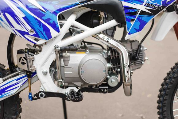 О надёжный питбайк APEX125 идеален для поездок по грунтовым дорогам и бездорожью. Хорошо чувствует себя на мягком и среднем грунте, разгоняется до 90 км/ч. Оснащён CNC траверсами, фарой, алюминиевыми ободами, весит всего 90 кг. Питбайк прост в управлении и не требует специального ухода, подойдёт как новичкам, так и любителям мотокросса.У кроссового мотоцикла APEX125 отличный узнаваемый дизайн. Конструкция подчёркивает неуступчивый спортивный характер питбайка, который не остановится ни перед одним препятствием. Пластик комбинированный, прочный, не ломается при сгибании. Кроссовый мотоцикл APEX125 доступен в красном и синем цвете, при этом в основной цвет окрашен не только пластик, но и обода колёс и другие детали питбайка.Передняя подвеска — телескопическая нерегулируемая вилка перевёрнутого типа, которая отлично подходит для преодоления ям, ухабов и других неровностей плохих дорог или их отсутствия. Задняя подвеска маятниковая с моноамортизатором. Руль 22 мм с высоким подъёмом и перекладиной удобен для мотоциклистов разного роста. Ручки руля — комфортные PRO TAPER. Питбайк оснащён складными рычагами сцепления и переднего тормоза, а также CNC-лапкой переключения передач.Питбайк весит всего 75 кг, при этом выдерживает вес до 150 кг. Оснащён CNC траверсами, рама полудуплексная стальная, мотоцепь качественная. Колёса спицованные, сделаны из прочного и лёгкого алюминия. Размер заднего колеса — 14 дюймов (350 мм), переднего — 17 дюйм (430 мм). Тормоза дисковые, передний тормозной суппорт двухпоршневой, задний — однопоршневой.Питбайк оснащён карбюратором с фильтром нулевого сопротивления VM22 MIKUNI и одноцилиндровым четырёхтактным двигателем с воздушным охлаждением. Надёжный мотор мощностью 9 л. с. и объемом 125 см³ разгоняет кроссовый мотоцикл APEX125 до 90 км/ч. Коробка передач механическая, четырёхступенчатая. Система зажигания электронная (CDI), для запуска двигателя можно использовать кикстартер и электростартер.СверхпроходимостьПокрышки с шипами и высоким грунтозацепом идеальны для бездорожья. Мощность мотора и небольшой вес питбайка позволяют ему преодолевать значительные препятствия и непролазную грязь, хорошо заходить в подъёмы.Для поездок при низкой видимости и в ночное время суток питбайк оснащён фарой, которая включается при повороте замка зажигания (1 – выключить, 2 – включить, 3 – свет). Также в комплекте есть щиток для номера, который ставится вместо фары.Питбайк 125 относится к недорогим моделям, которые при должной эксплуатации работают без сбоев и капризов. Кросс неприхотлив в обслуживании, не занимает много места в гараже. При необходимости в нём легко сменить любую повреждённую деталь. Купить питбайк 125 вы можете в официальном магазине Мотолэнд, здесь же всегда можно приобрести запасные детали и комплектующие, которые стоят недорого и всегда есть в продаже. При покупке питбайка не забудьте о защитной экипировке.