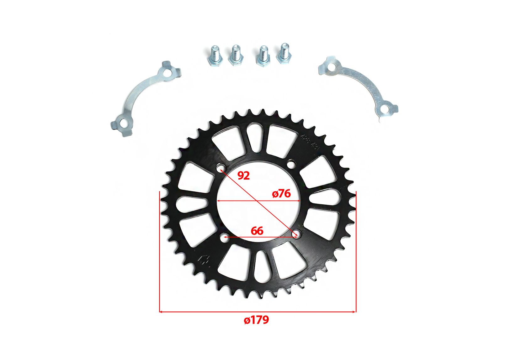 Задняя ведомая звезда для питбайков с 43 зубьями, предназначенная для цепи типа 420. Изготовлена из прочной стали с закаленными зубьями для повышенной износостойкости. Центральное отверстие 76 мм, крепление по схеме 4×92 мм. Совместима с питбайками 125-190 см³.